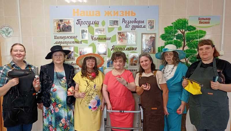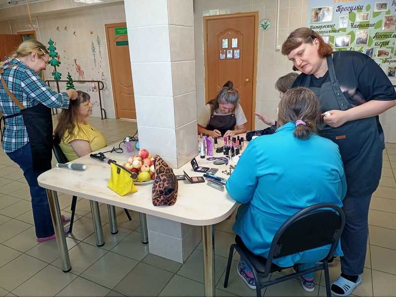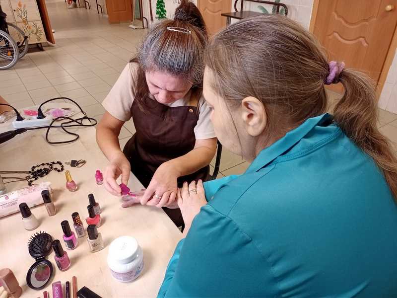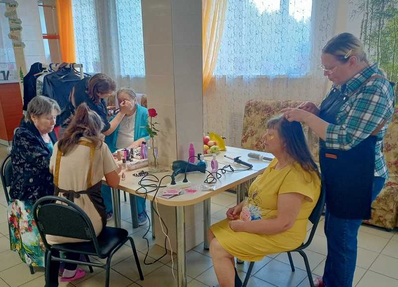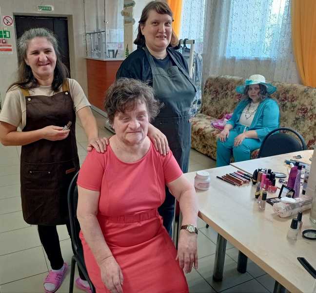 Настя, Марина и Ирина, которые живут в нашем учреждении, решили сегодня сделать приятный сюрприз для наших дам более прекрасного возраста... Настя работала над макияжем, Марина занималась причёсками, а Ирина отвечала за маникюр.